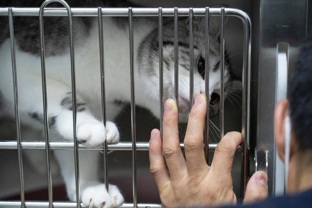 对比较“粘人”的猫咪,高进东有时会把它们抱在怀里安抚(3月24日摄)。