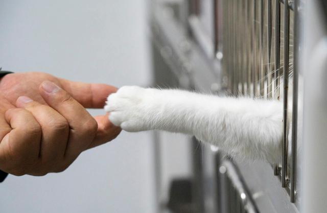 在武汉默东动物医院(光谷分院),一只小猫与人伸爪互动。