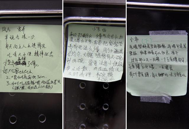 在默东动物医院猫舍的门上都会有一张写着对应猫咪的“照料指南”,这些贴士指南由高进东的同事或猫主人写好,这让高进东对动物的照料更加有的放矢。
