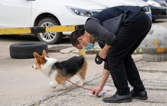 高进东在遛狗时用塑料袋捡走狗粪。