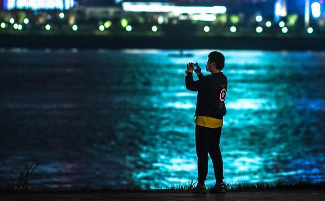 ↑3月26日晚,市民在汉口江滩公园江边拍照。
