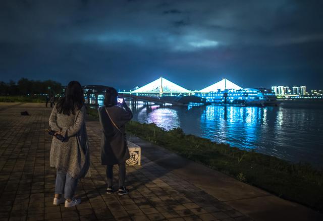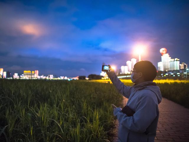 3月26日晚,市民在汉口江滩公园三阳广场江边拍照。