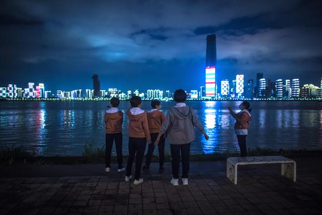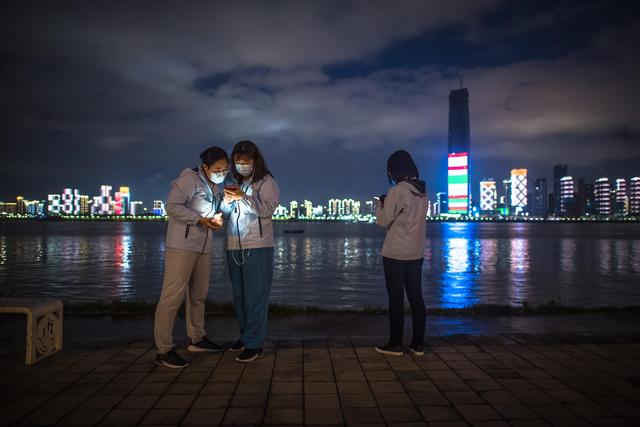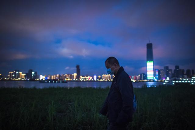 3月26日晚,北京医疗队队员在汉口江滩公园江边驻足。