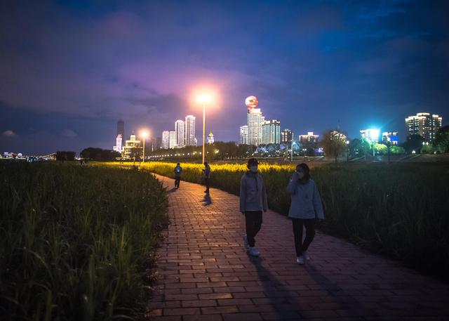 3月26日晚,北京医疗队队员在汉口江滩公园散步。