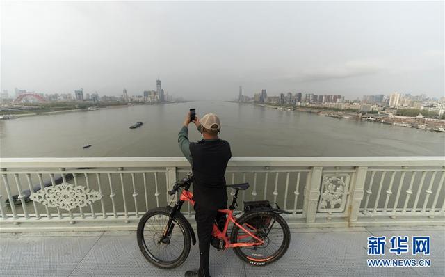 3月25日,在武汉长江大桥,一名骑行的市民停下来拍照。新华社记者 费茂华 摄