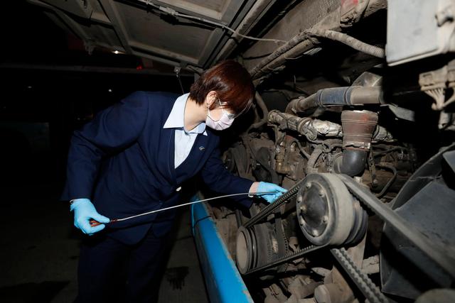↑3月25日,司机黄婧在出车前检查汽车机油情况。
