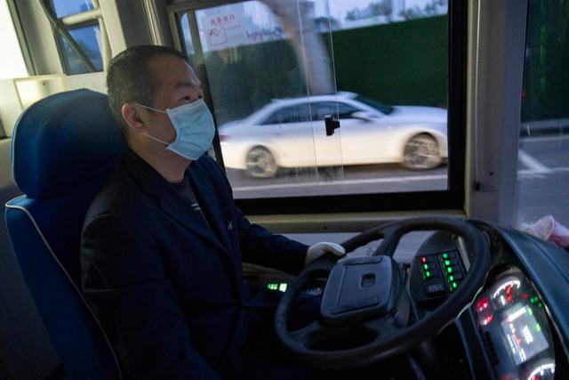↑3月25日,在武昌火车站综合体站始发的首趟518路公交车上,安全员熊伟望着窗外路边的?;?。
