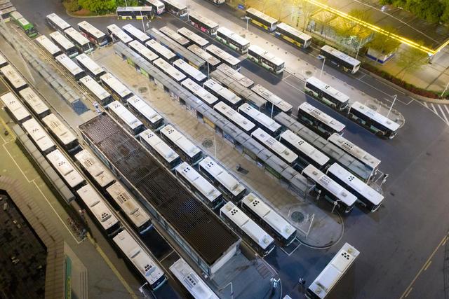 ↑3月25日在武汉汉口火车站的公交车站拍摄的准备出发的公交车(无人机照片)。