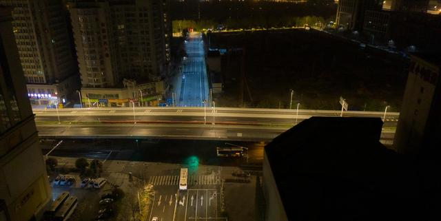 ↑3月25日,在武汉汉口火车站附近,首班533路公交车行驶在路上(无人机照片)。