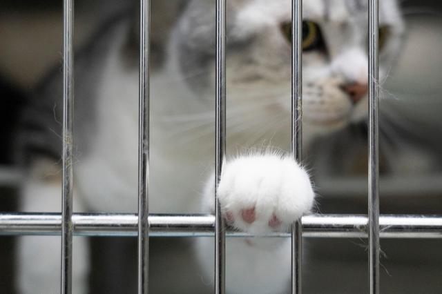 在武汉默东动物医院(光谷分院),一只小猫与人伸爪互动。