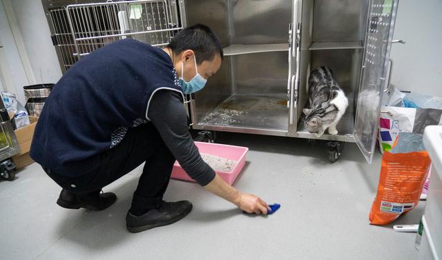 在武汉默东动物医院(光谷分院),高进东给小猫铲猫砂。