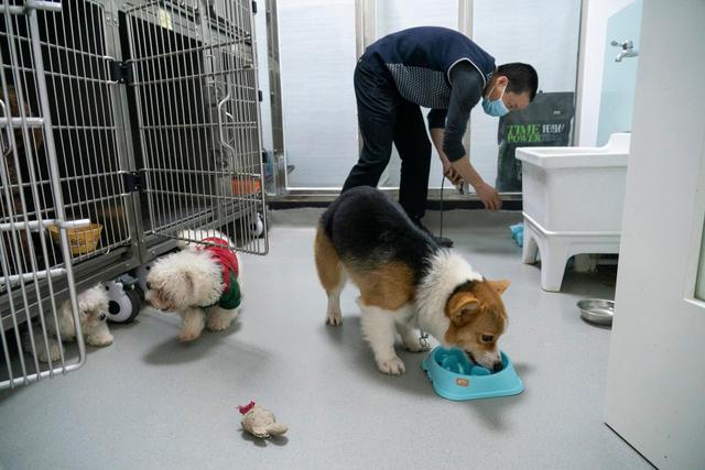 临时“奶爸”高进东带着一只寄养的宠物狗穿过动物医院的工作间。