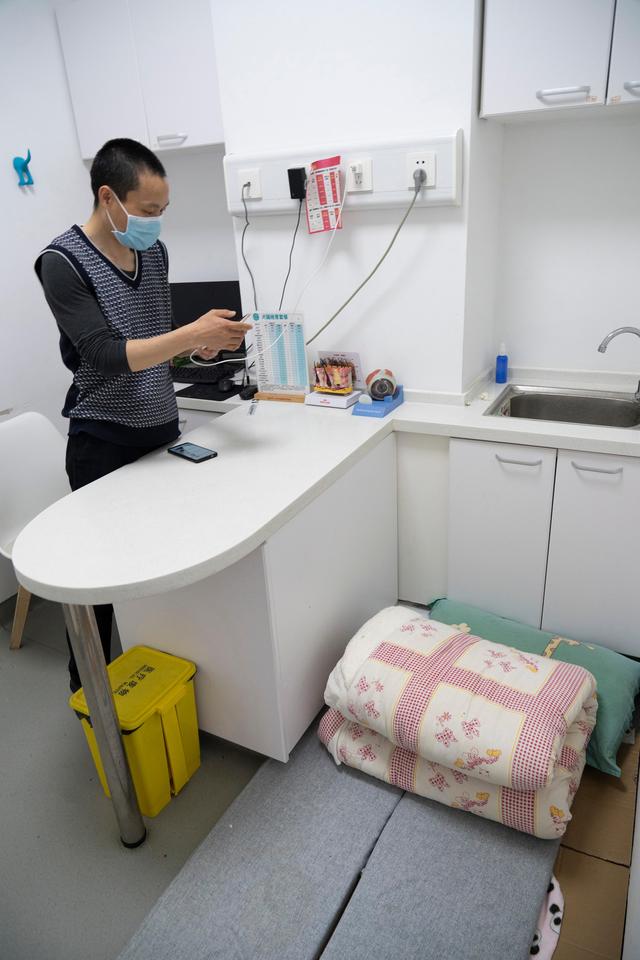 高进东展示自己在办公室的地铺,他在这里睡了两个月。
