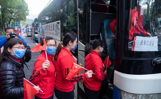 ↑3月31日,北京市属医院医疗队队员登上大巴车前往机场返程。