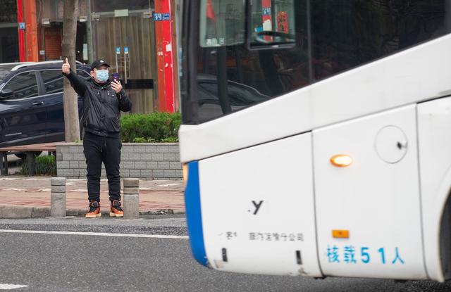 ↑3月31日,一名市民竖起大拇指送别北京市属医院医疗队队员。