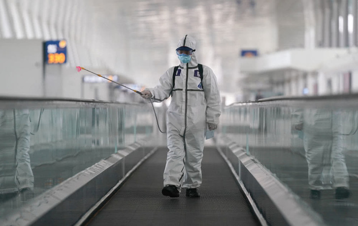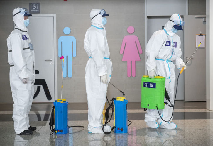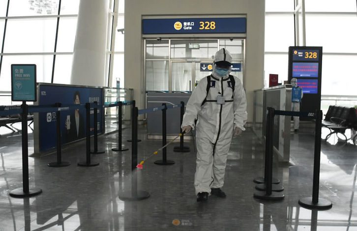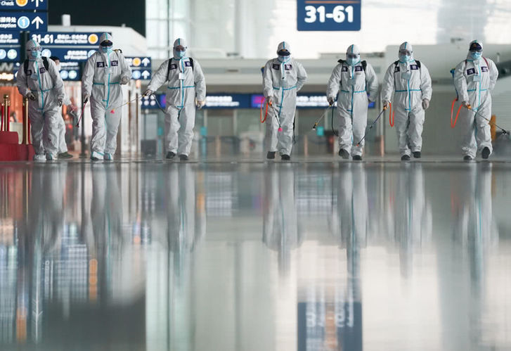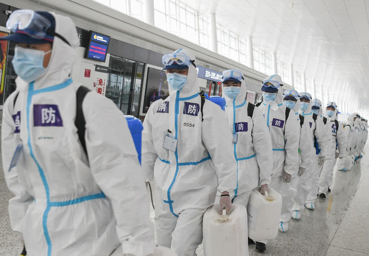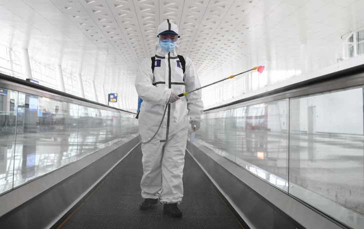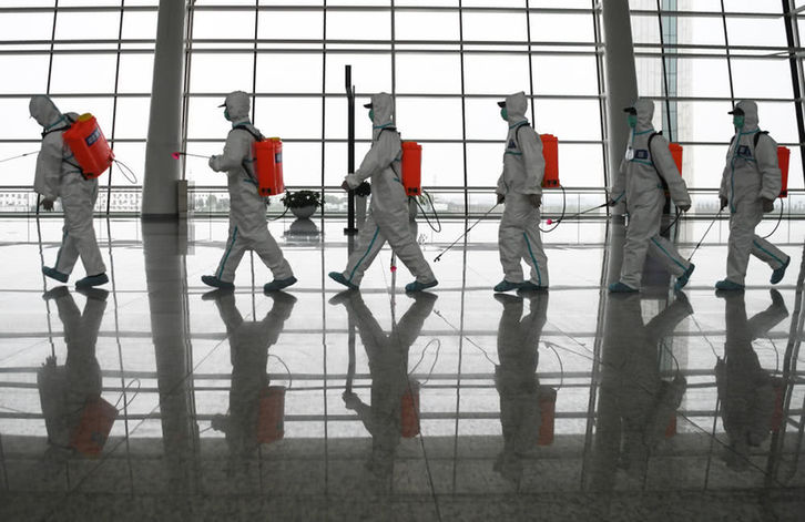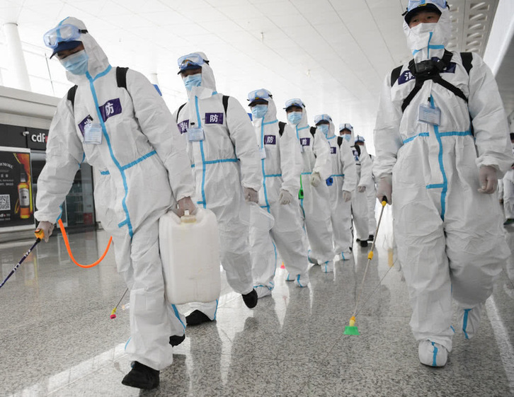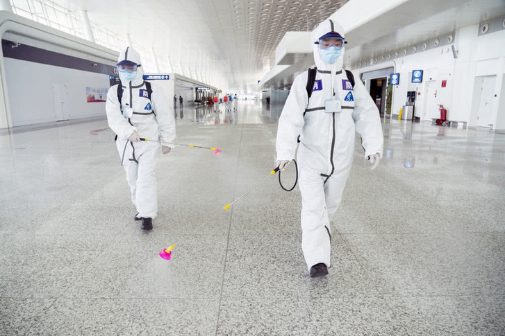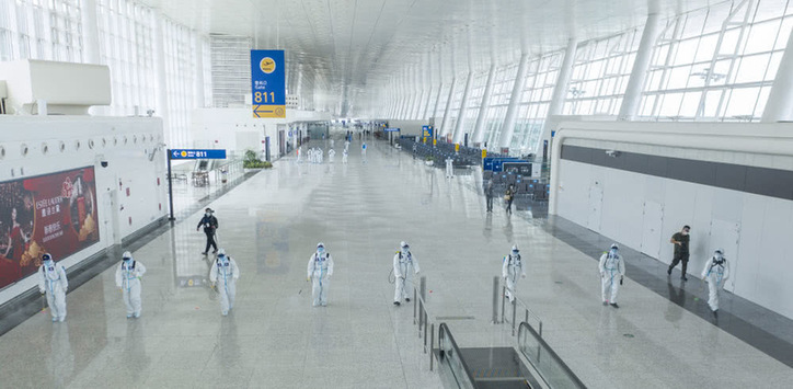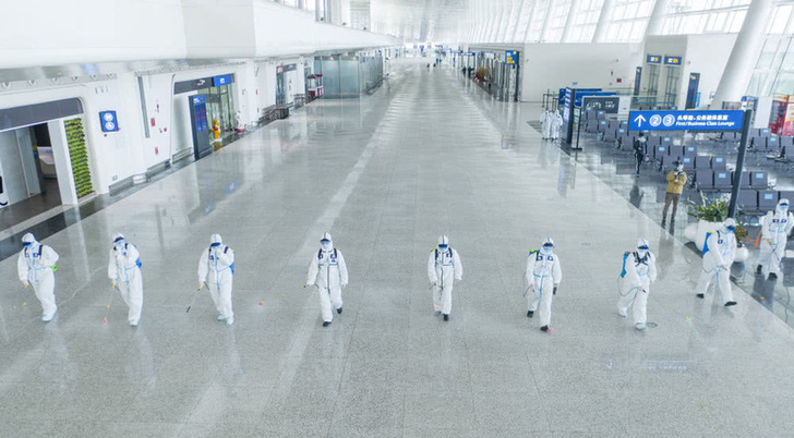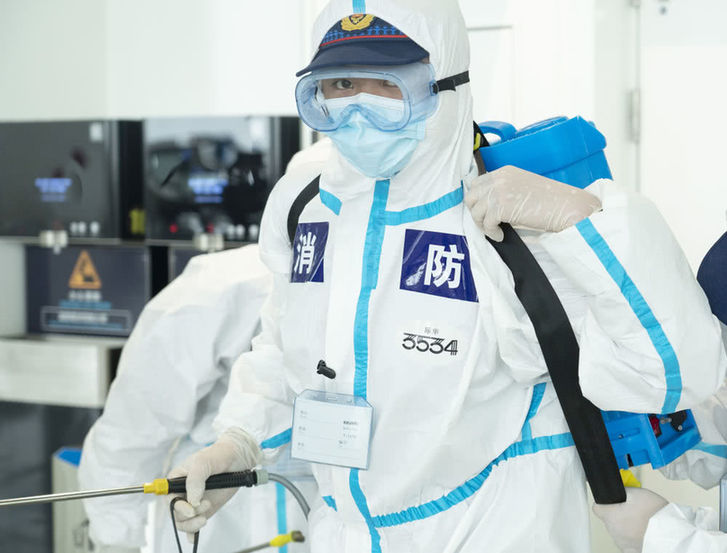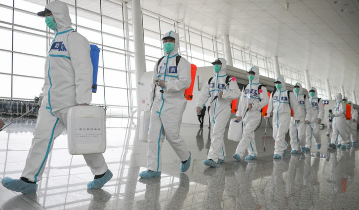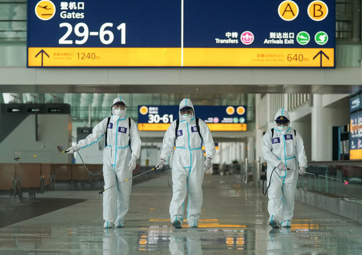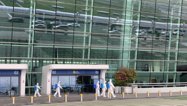 4月3日,消防队员进入航站楼进行消杀作业。新华社记者程敏摄