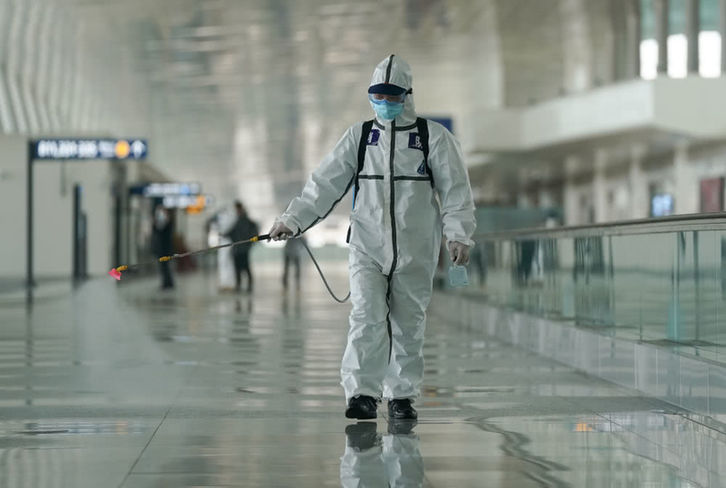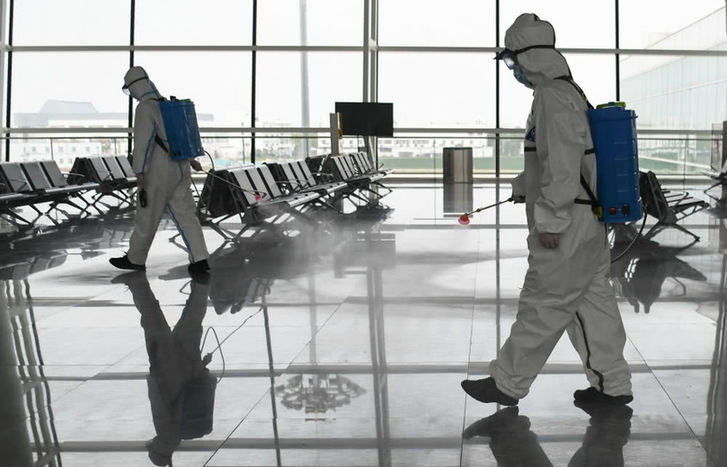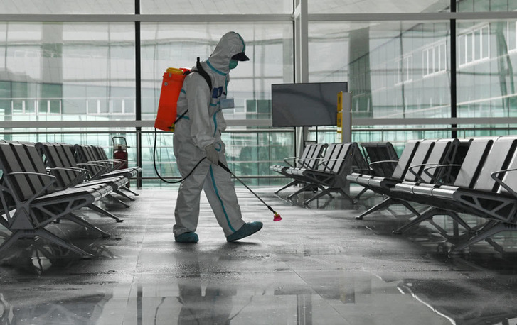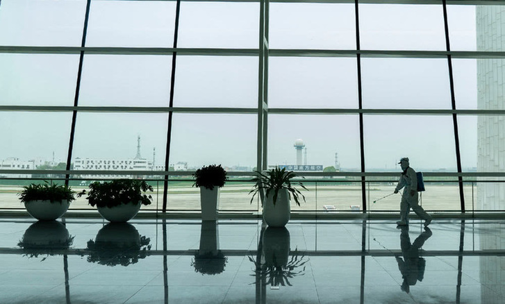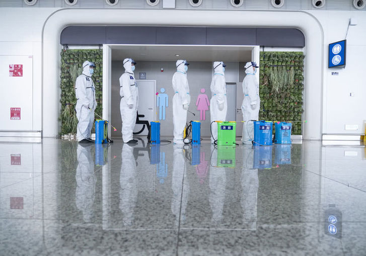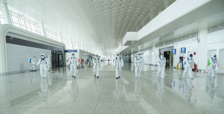 4月3日,消防队员在航站楼进行消杀作业。新华社记者程敏摄