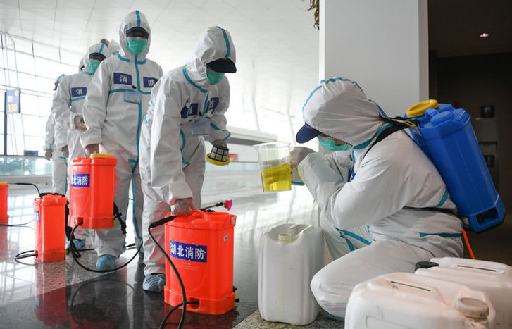 4月3日,消防队员在武汉天河国际机场T3航站楼内列队准备进行消杀作业。新华社记者才扬摄