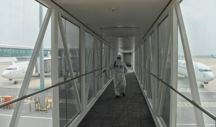 4月3日,消防队员在航站楼廊桥进行消杀作业。新华社记者程敏摄