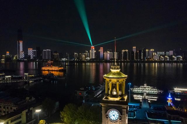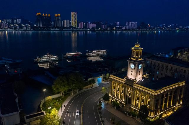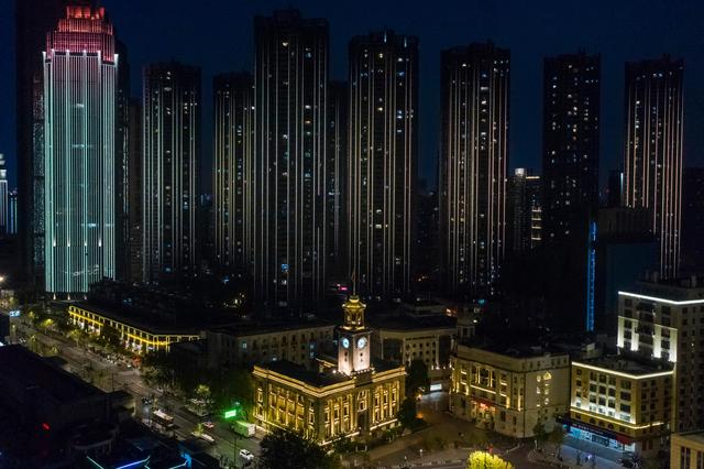 ↑这是4月7日晚拍摄的武汉市江汉关博物馆及附近建筑灯光夜景(无人机拍摄)。