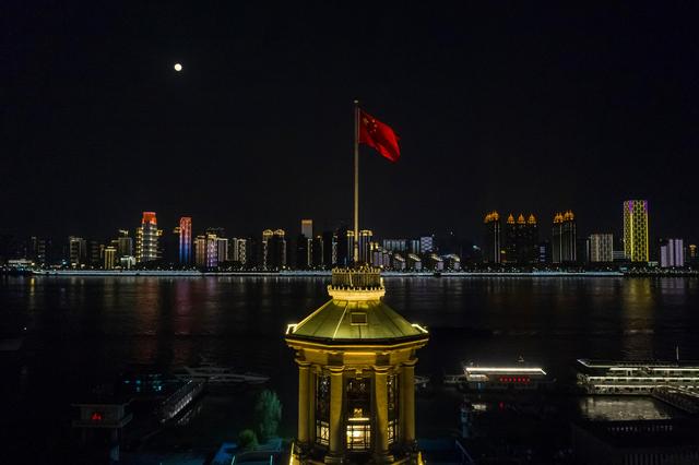 ↑这是4月7日晚拍摄的武汉市江汉关博物馆及长江对岸建筑灯光夜景(无人机拍摄)。