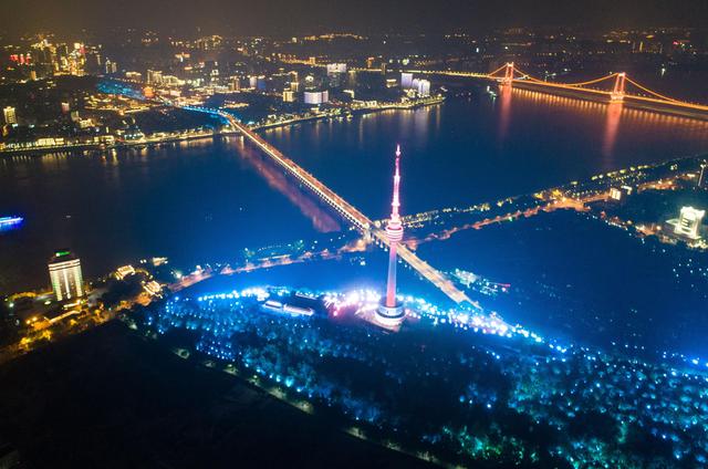 ↑4月7日晚在武汉龟山拍摄的夜景(无人机照片)。