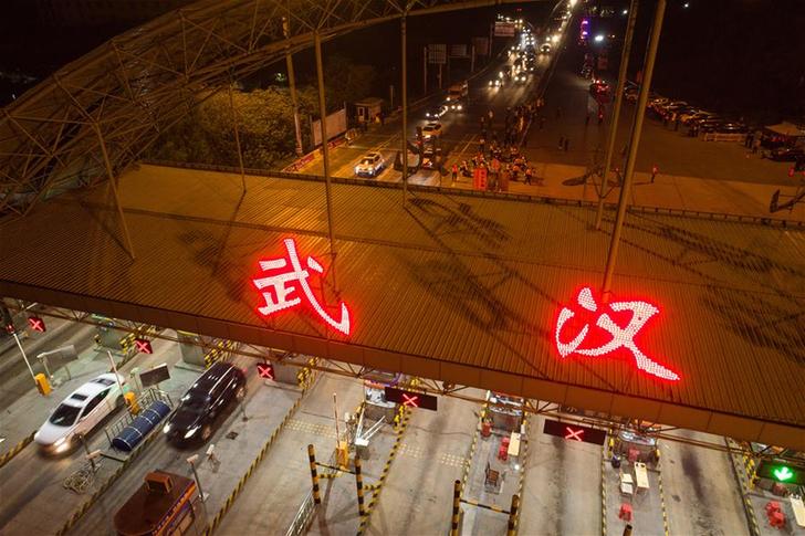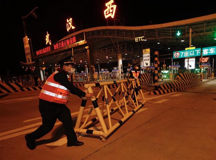 4月8日凌晨,在武汉北高速收费站,工作人员移除围栏。 4月8日零时起,武汉市正式解除离汉离鄂通道管控措施,有序恢复对外交通。新华社记者 肖艺九 摄