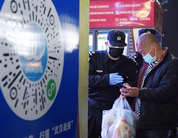 4月8日凌晨,值守在武昌火车站的工作人员协助进站乘客扫描健康码。 4月8日零时起,武汉市正式解除离汉离鄂通道管控措施,有序恢复对外交通。 新华社记者 李贺 摄