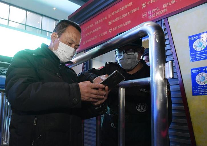 4月7日晚,旅客在武昌火车站向工作人员出示健康码。 4月8日零时起,武汉市正式解除离汉离鄂通道管控措施,有序恢复对外交通。新华社记者 费茂华 摄