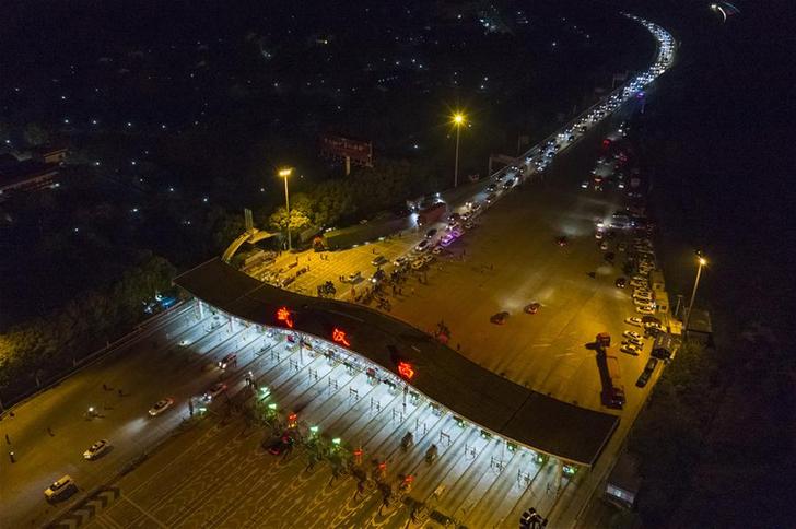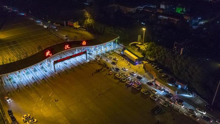 4月8日凌晨,车辆通过武汉西高速收费站(无人机照片)。 4月8日零时起,武汉市正式解除离汉离鄂通道管控措施,有序恢复对外交通。 新华社记者 沈伯韩 摄
