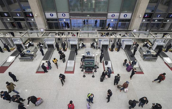 4月7日晚,旅客接受安检后进入武昌火车站。 4月8日零时起,武汉市正式解除离汉离鄂通道管控措施,有序恢复对外交通。新华社记者 费茂华 摄