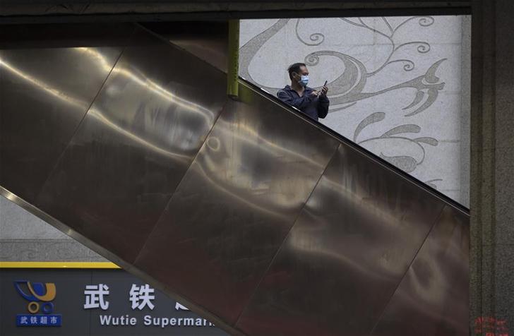 4月7日晚,一名旅客在武昌火车站拍摄站内情景。 4月8日零时起,武汉市正式解除离汉离鄂通道管控措施,有序恢复对外交通。新华社记者 费茂华 摄