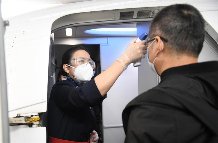 4月8日,在武汉天河国际机场,乘坐东方航空MU2527航班的旅客登机前接受体温检测。 4月8日零时起,武汉市正式解除离汉离鄂通道管控措施,有序恢复对外交通。 新华社记者 程敏 摄