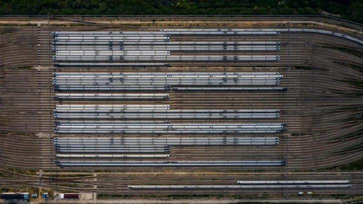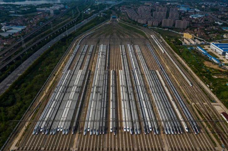▲ 4 月 7 日,在武汉动车段,列车??吭诖娉迪呱希ㄎ奕嘶掌?/p>