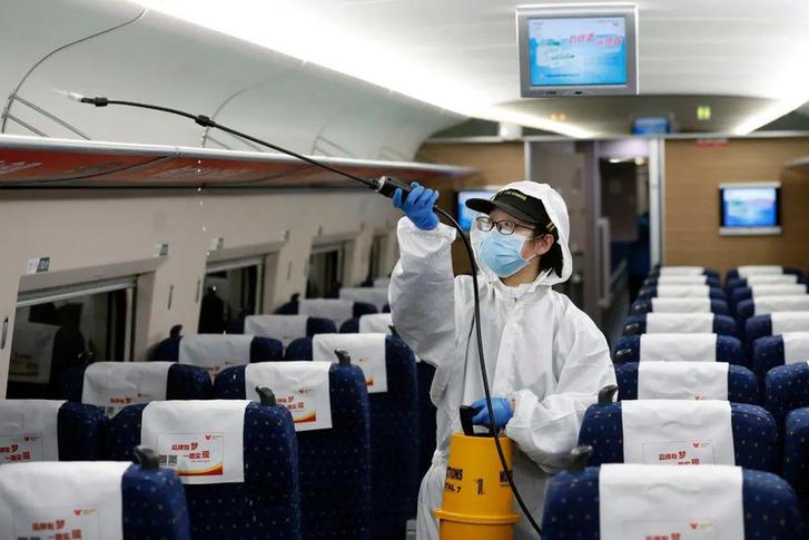 ▲ 4 月 7 日,武汉动车段运用车间工作人员周明辉在给列车消毒。