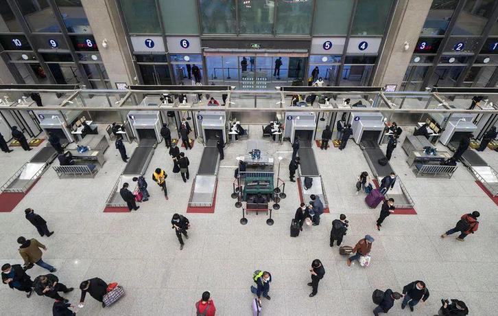 ▲ 4 月 7 日晚,旅客接受安检后进入武昌火车站。