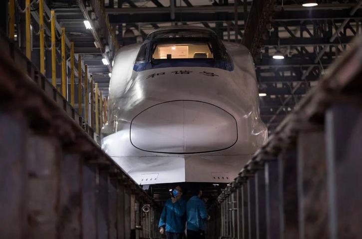 ▲ 4 月 8 日,武汉动车段汉口动车运用车间地勤机械师涂梦圆(左)和同事对 D9301 次列车进行检查。