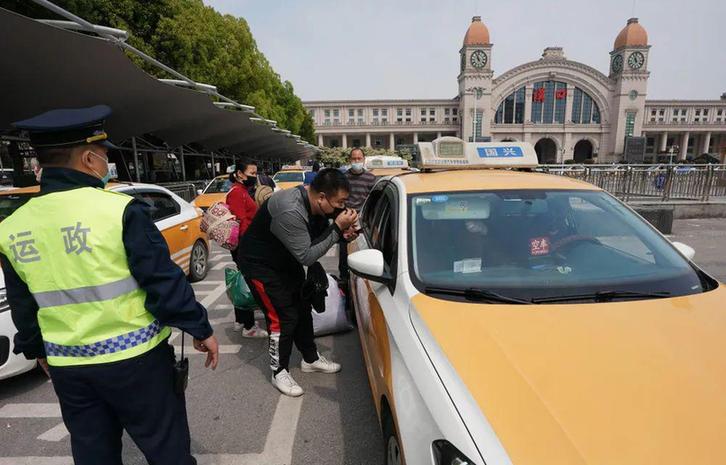 ▲ 4 月 8 日,在武汉汉口火车站前,乘客与出租汽车司机沟通。当日,武汉巡游出租汽车恢复运营,乘客凭健康码 " 绿码 " 实名乘车。