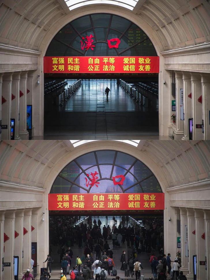 下图:4 月 8 日拍摄的汉口火车站进站大厅。(拼版照片)