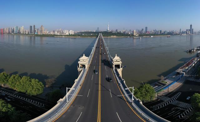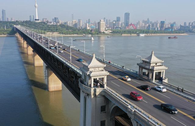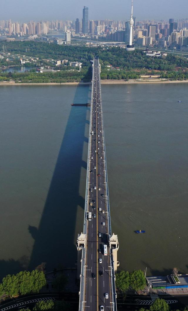 ↑4月15日在早高峰时段拍摄的武汉长江大桥。