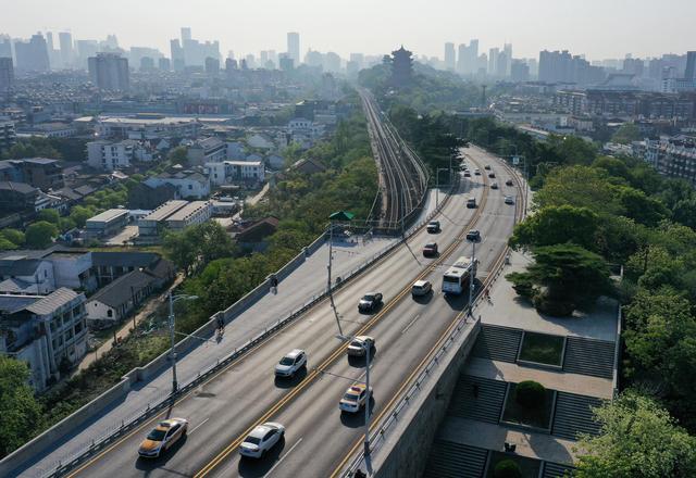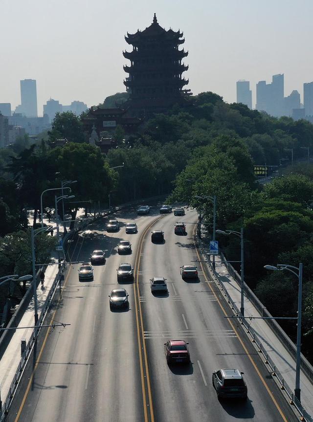 ↑4月15日在早高峰时段拍摄的武汉长江大桥(无人机照片)。