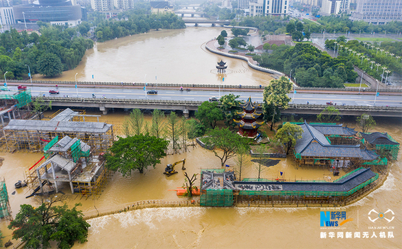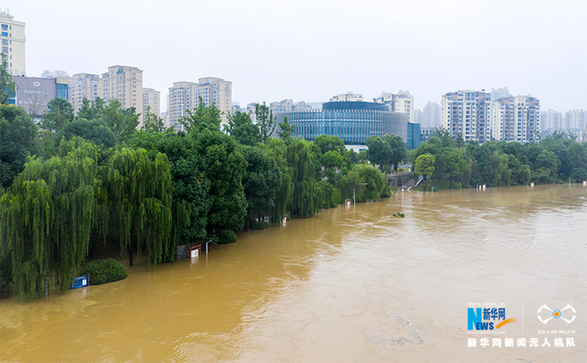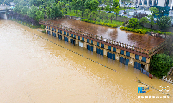 6月28日,重庆市南川区,洪水淹没滨河公园步行道。新华网发(甘昊旻 摄)