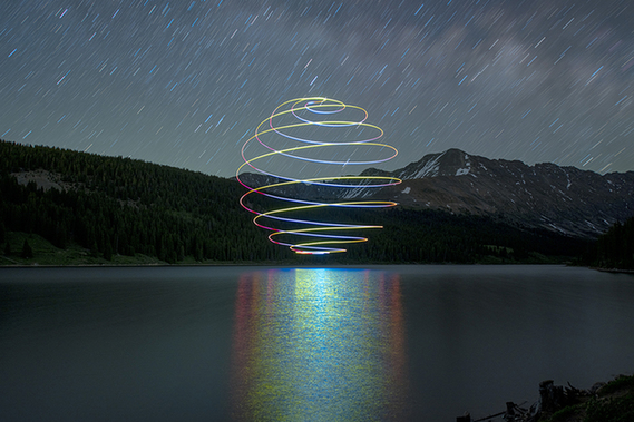 据介绍,他飞无人机并不是为了航拍,而是用它携带的LED灯在天空作画,然后用一台配备三脚架的尼康D810A相机记录其轨迹。他说,“我艺术创作的不是照片,它是一个时空雕塑。”