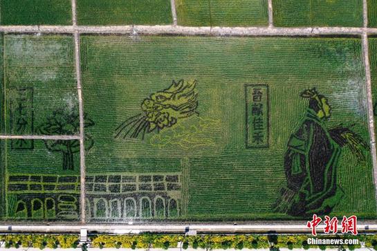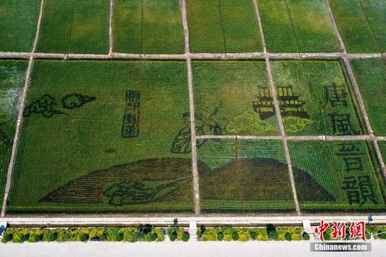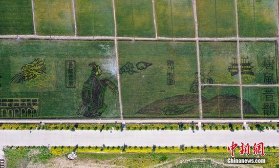 7月6日,山西太原花塔村,航拍“唐风晋韵”主题稻田画。中新社记者 武俊杰 摄