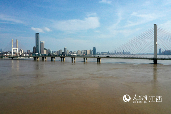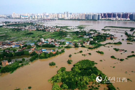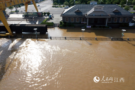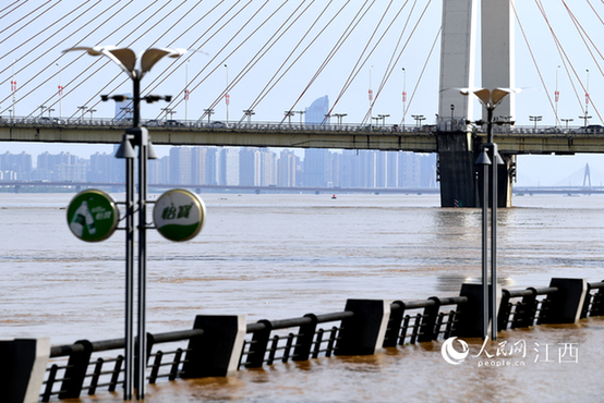 原标题:高清图:赣江南昌段水位超警 洪水淹没江边步道