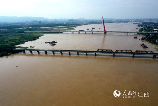赣江铁路大桥上,一列动车降速缓慢通行。(人民网时雨/摄)