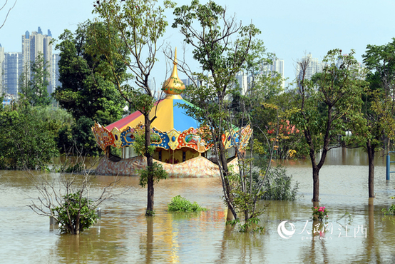 凤凰洲市民公园部分区域被江水浸泡(人民网 时雨/摄)