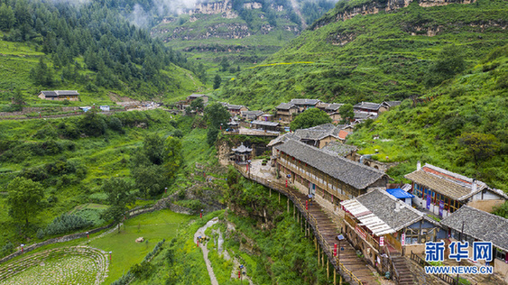 王化沟村内,街道是由立木支撑、圆木铺架的栈道。走进村子深处,可见石砌的小径、古朴的民居。一场雨后,这里越发静谧。