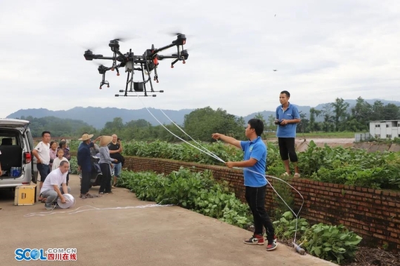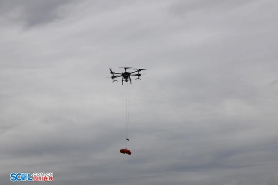 无人机将绳索空投到被困人员位置,胡朝洪利用绳索绑紧小船,岸上人员进行拖拽,成功将被困人员救出。