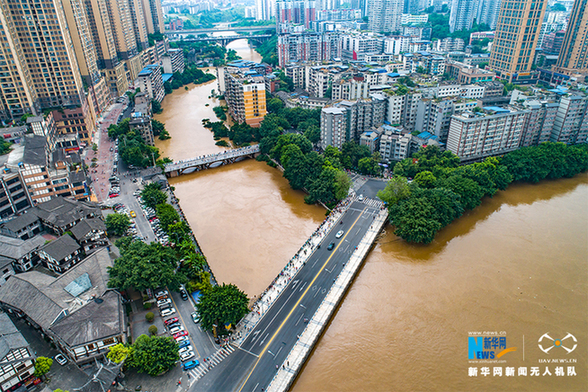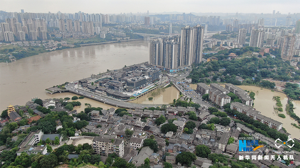 8月18日中午12点左右,重庆市沙坪坝区,洪水通过磁器口古镇。新华网发(喻庆 摄)